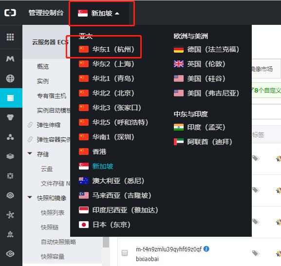 选择服务器目标地域,该目标地域就是我们要迁移到A账号下服务器的地域(这里是从新加坡迁移到杭州)