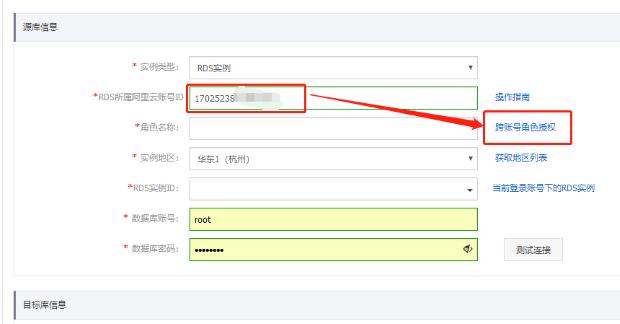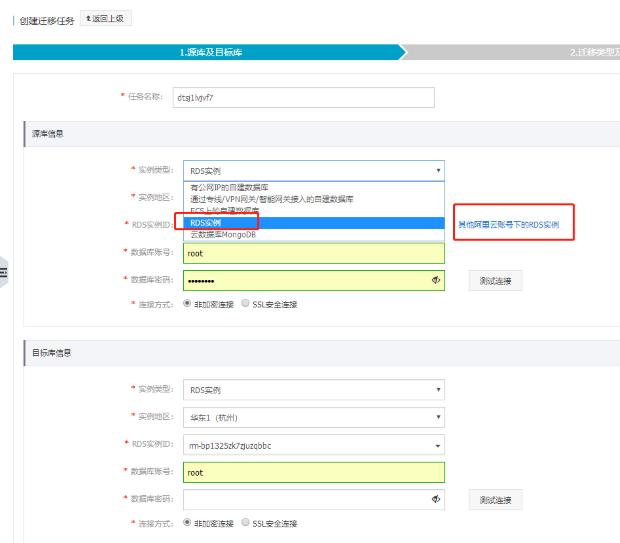 源库信息 实例类型 选择 RDS 实例 点击其他阿里云账号下的RDS实例