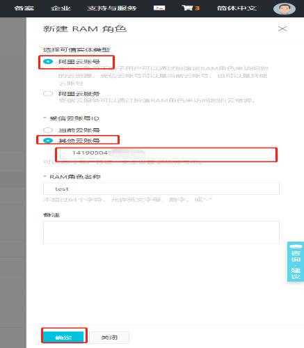 选择 阿里云账号 -> 其他云账号 -> 账号 -> 确定