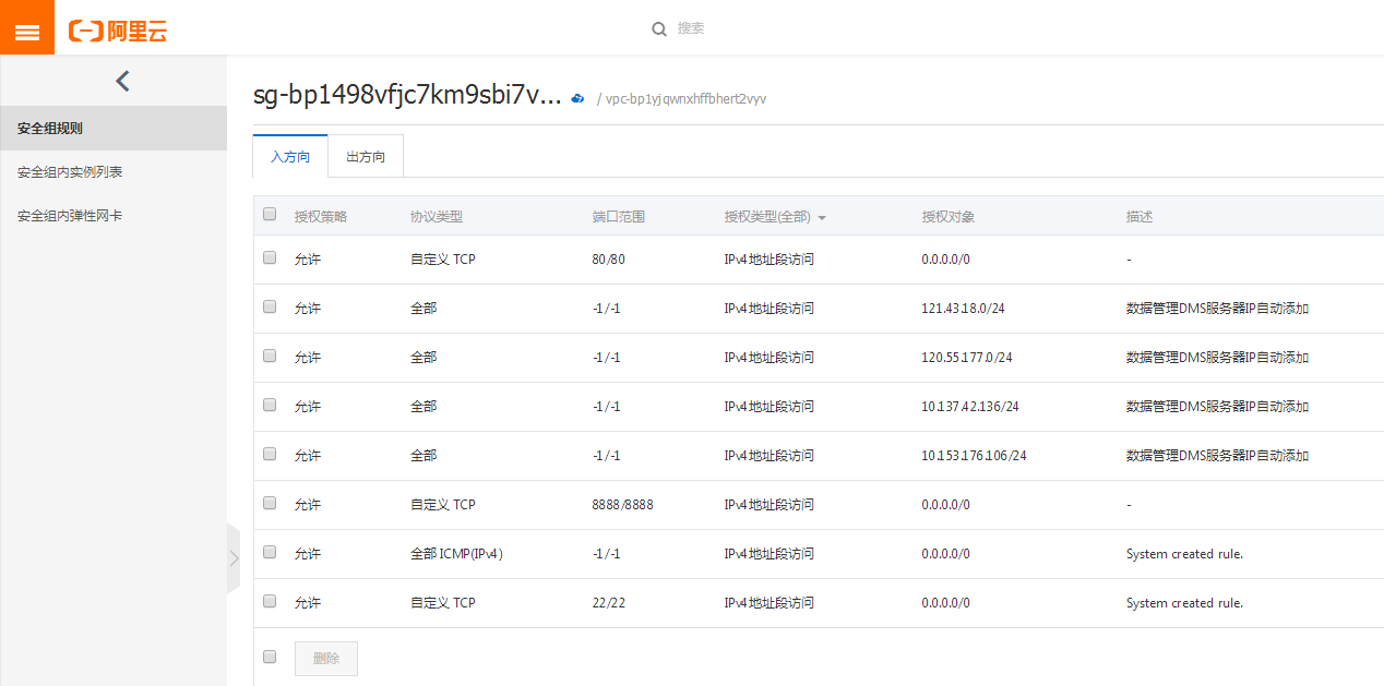 入方向看到的就是目前服务器的安全组规则了,你可以在这里添加、修改、删除规则。