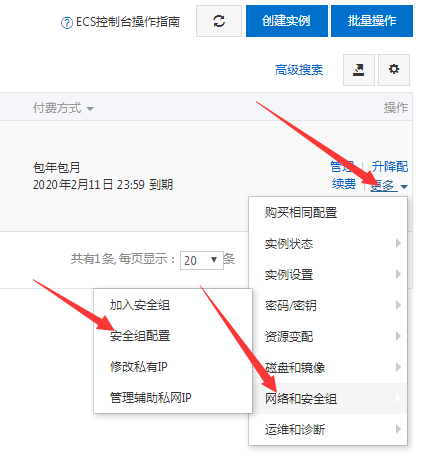 同样在实例最右侧点击【更多】>>【网络和安全组】>>【安全组配置】