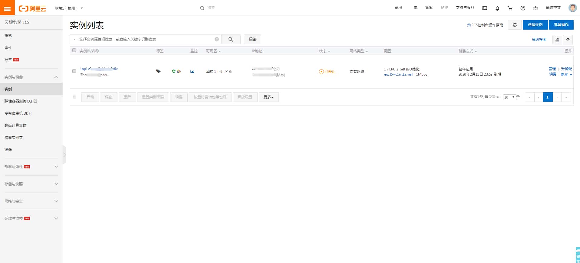点击实例,在左上角选择区域(一定要选对地域才能看到服务器),这时看到服务器信息了,如图: