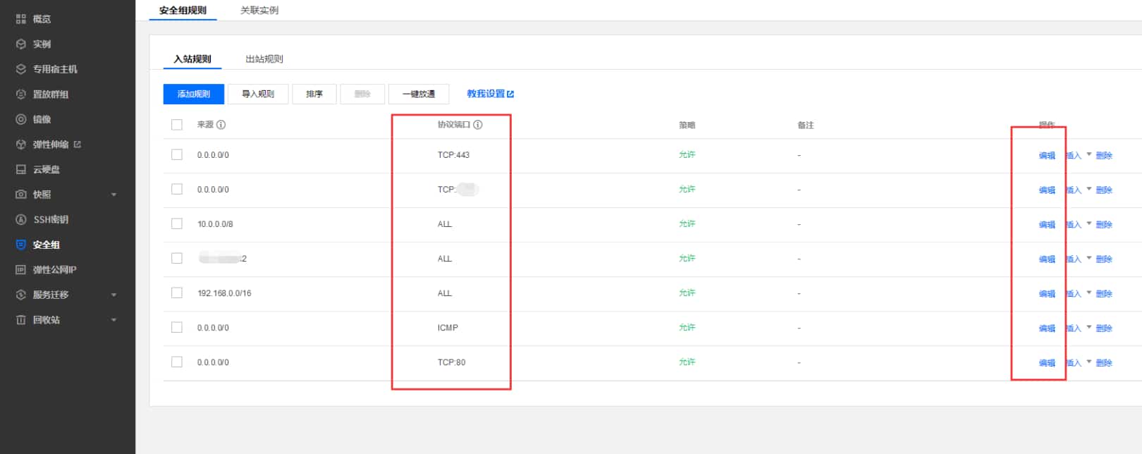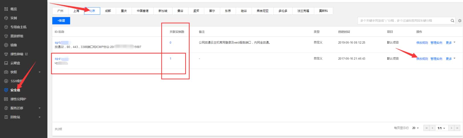 在控制台左侧点击安全组,右侧上面选择地域,看到有2个已有的安全组。一个是系统默认的,一个是正在用的(已经关联1个实例,说明是在用的)