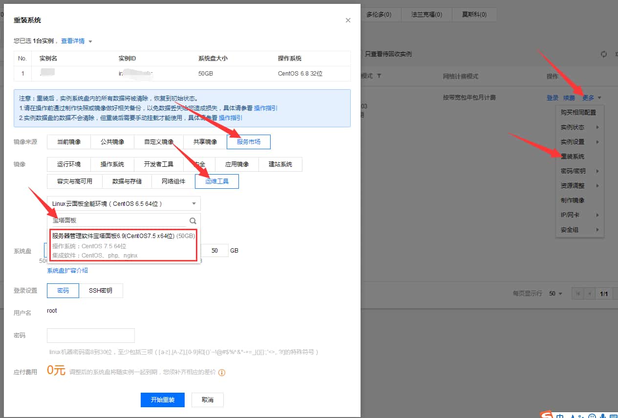 买好服务器后,开始安装面板。点击服务器列表的【更多】》重装系统。