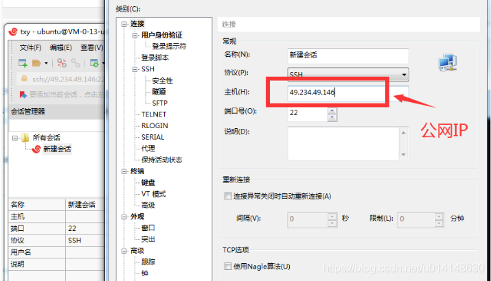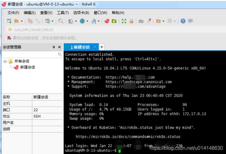 打开Xshell,点击【文件】→【新建】输入云服务器的公网ip地址,点击【连接】(公网IP,用户名和密码,腾讯云后台给发的站内信中可以找到)