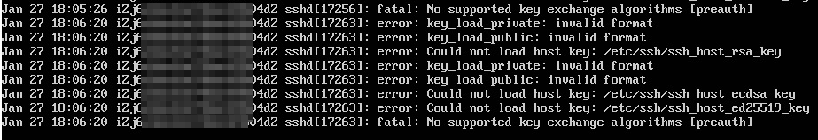 ECS实例无法使用ssh命令登录,通过VNC登录实例发现/var/log/secure日志文件中出现“No supported key exchange algorithms”报错。