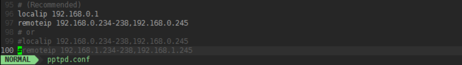 sudo vim /etc/pptpd.conf #如图将96~97#去掉