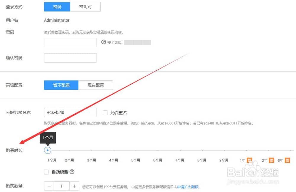 设置用户名及密码、登录方式、云服务器名称、购买时长及数量>即可。