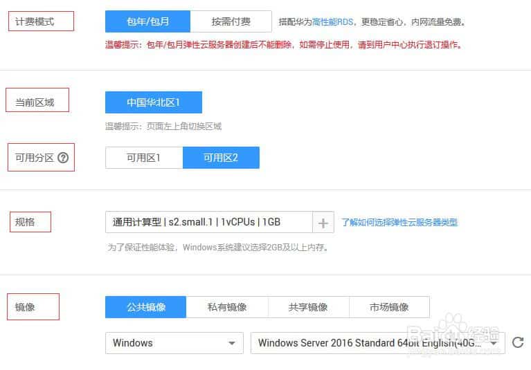 按需求选择你的计费模式、当前区域、可用分区、规格及镜像。