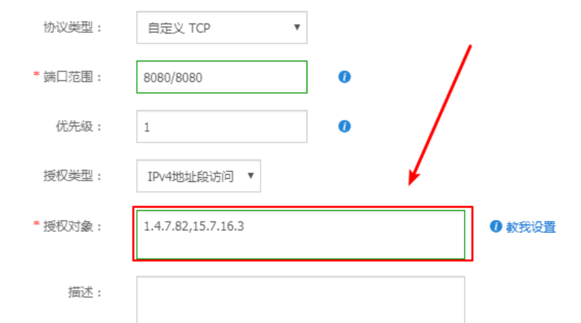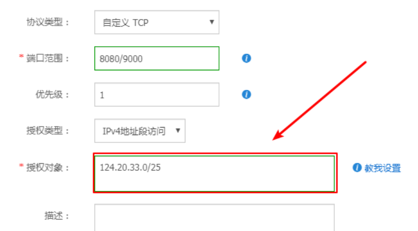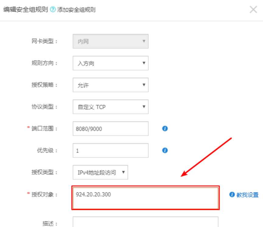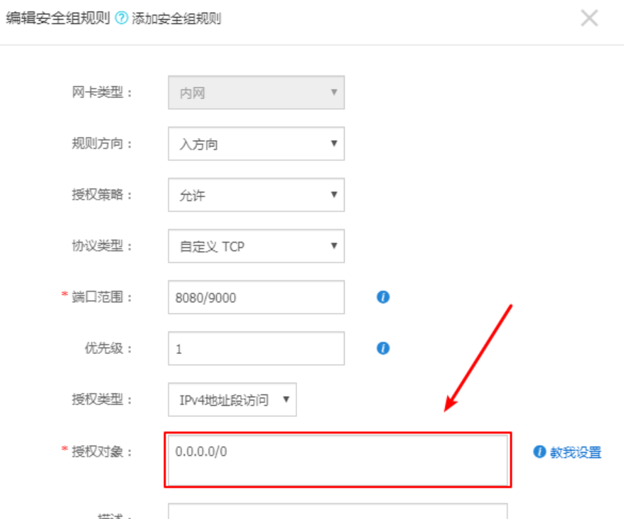 授权对象,这里我们要让所有人都可以访问,所以我们要写0.0.0.0/0