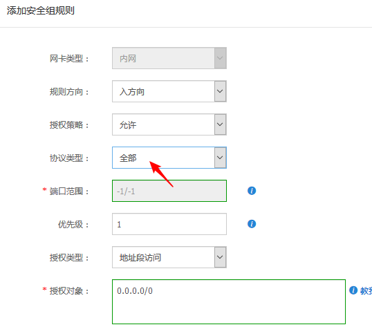 服务器内没安装防火墙的情况下,放行所有端口是非常危险的,请谨慎操作。协议类型选择全部,其它保持不变。
