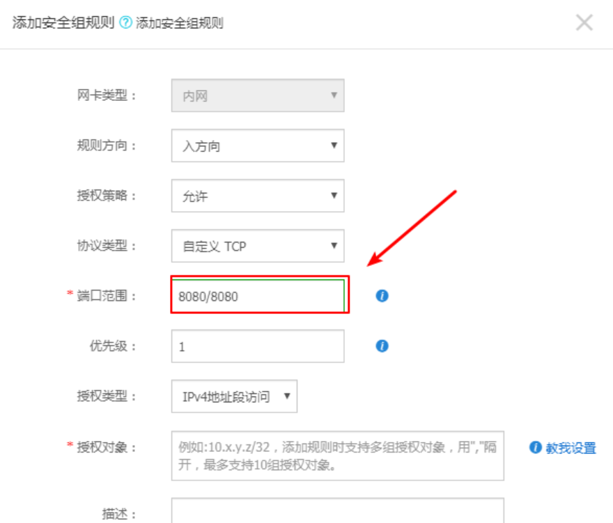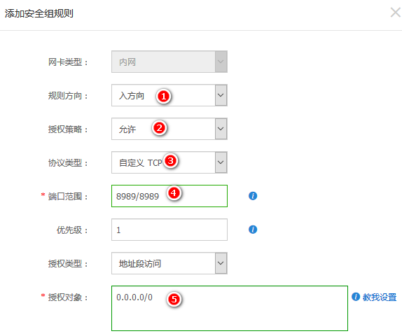 下图演示放行一个TCP 8989端口,类型一般选择自定义TCP,端口范围填写8989/8989,授权对象填写0.0.0.0/0。如果您不太清楚,一般按照图示填写即可。