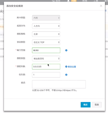 点击确定我们在安全组里的80端口就已经打开了。除了以上场景,安全组还用于设置内网互通拦截特定的IP和端口,只允许特定的IP来登录服务器,或者只允许读取访问公网上的某个特定的IP。