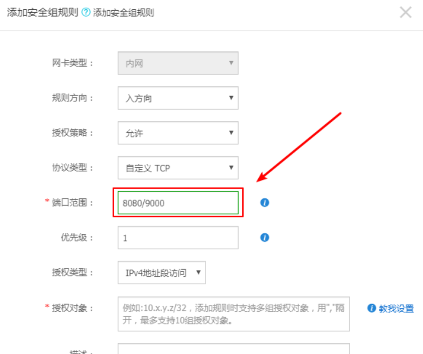 端口范围,这里要求填写的是一个范围,所以我们要写80/80。