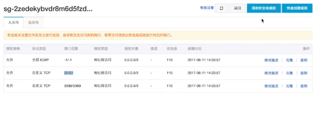我们已经看到了默认的三条规则,我们点击添加安全组规则。