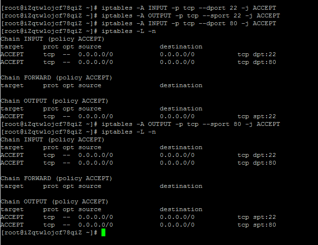 [root@tp ~]# iptables -A INPUT -p tcp --dport 22 -j ACCEPT [root@tp ~]# iptables -A OUTPUT -p tcp --sport 22 -j ACCEPT