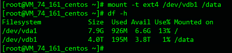 5、格式化完成后,使用mount命令挂载新分区,此时使用df –h命令可以查看到磁盘剩余容量