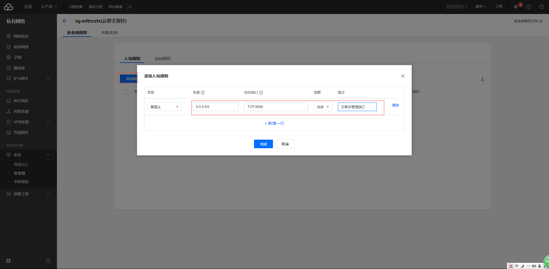 云帮手探针端服务将监听6688端口,需要手动将其添加到阿里云控制台安全组中,否则将无法正常提供服务!