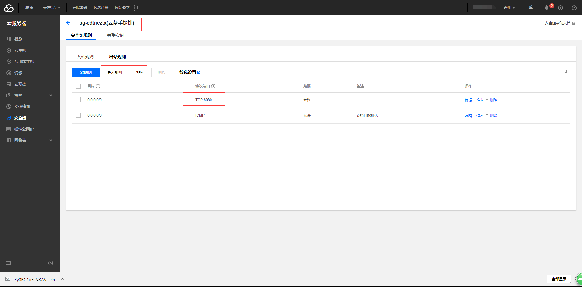注意:安装探针需要下载文件,腾讯云若在添加过程中无法下载文件请在安全组添加出站规则