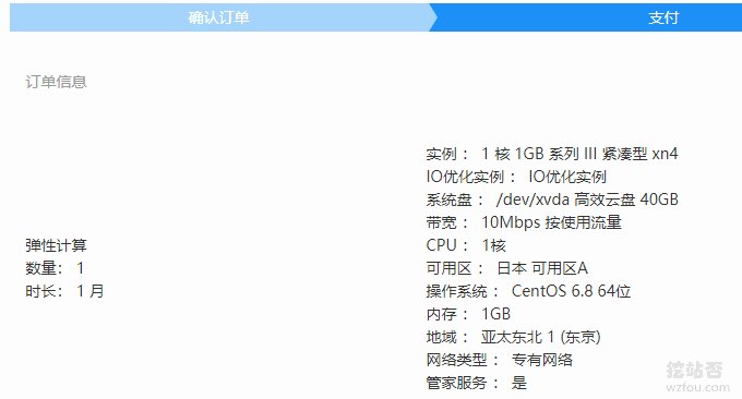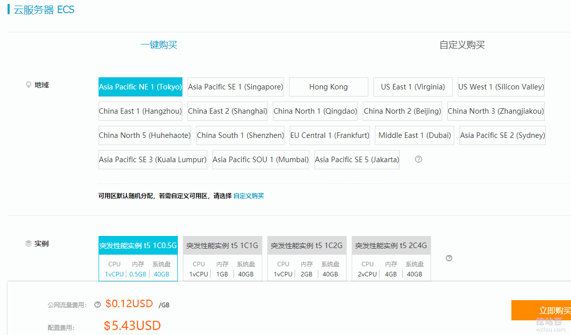 阿里云国际版的账号比较难注册,大家可以选择注册阿里云国内版的,直接使用支付宝付款即可,国际版的需要Paypal才可以付款。在阿里云国际版中选择一键购买,地域选择日本东京。(点击放大)