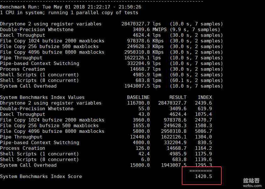 1GB内存的阿里云日本VPS使用Unixbench性能综合跑分,得分超过了1400,还是不错的。(点击放大)