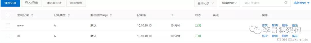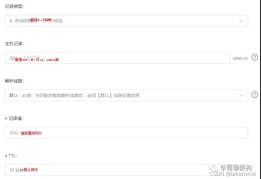 如果想通过laker.cn访问,则添加记录类型为A,主机记录为@,记录值为10.10.10.10
