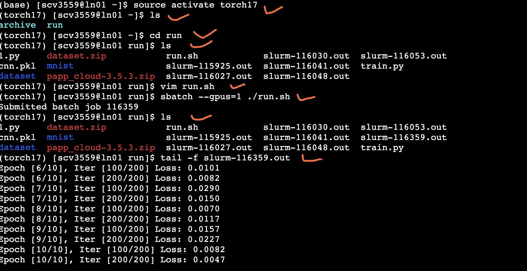 编辑run.sh、提交任务调用显卡、ls、查看输出等操作命令如下: