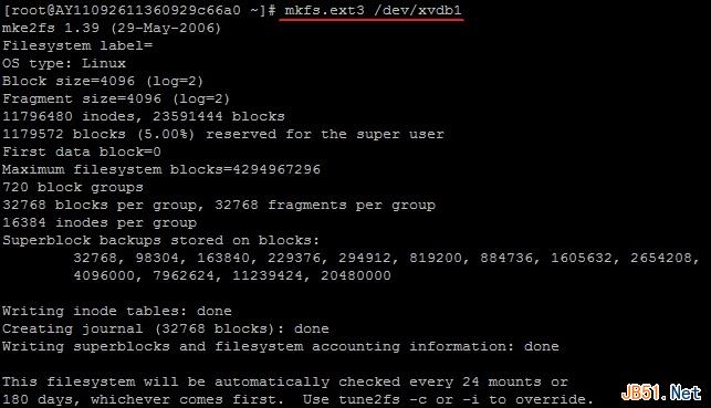 使用“mkfs.ext3 /dev/xvdb1”命令对新分区进行格式化,格式化的时间根据硬盘大小有所不同。