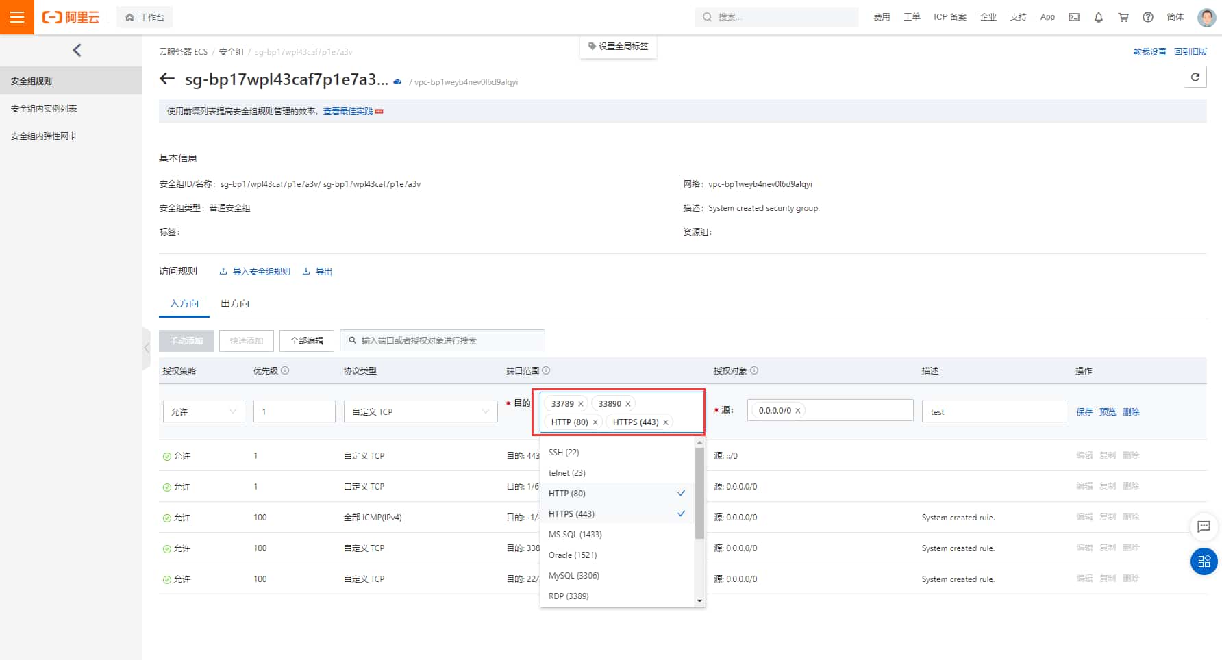 手动添加的话,直接输入端口号即可,可以输入多个端口号,用英文输入法逗号(,)隔开;源一般设置0.0.0.0/0,如果需要指定IP访问这个端口的话,源设置指定IP或段即可