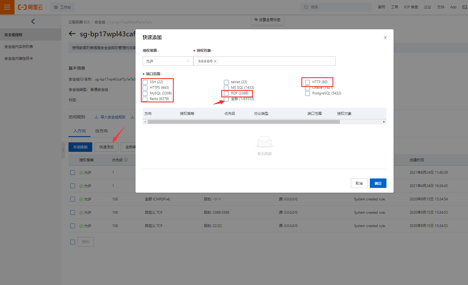 仅需配置入方向的,快速添加有阿里云展示常用的一些端口,点击添加放行即可,如果需要可以点击放行全部端口。