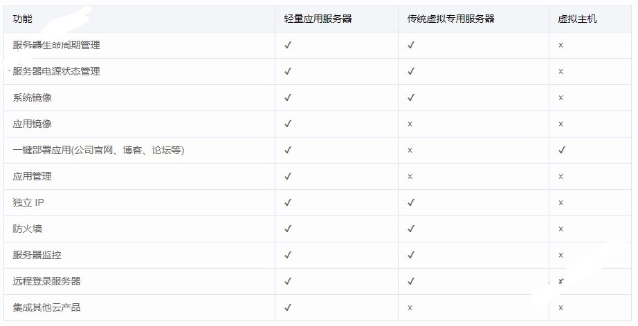 轻量应用服务器与 VPS 服务器、虚拟主机的功能对比