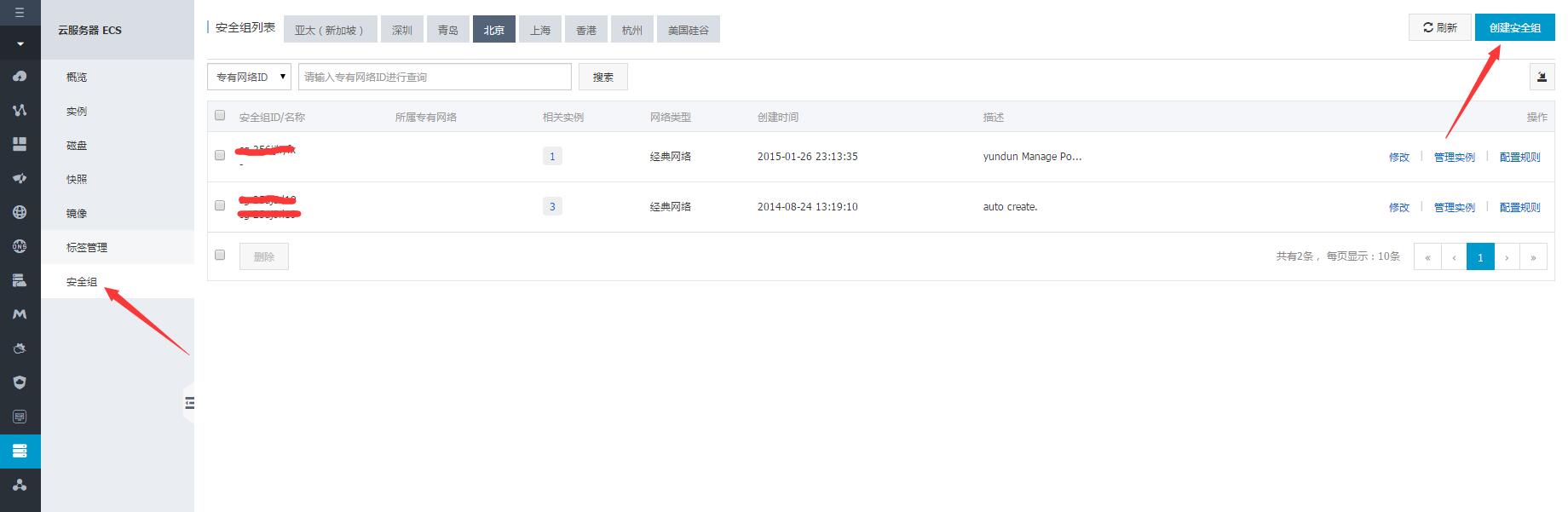 2、安全组创建好之后,点击右侧管理实例,将该账号下需要打通内网的ECS服务器加入到此安全组下;