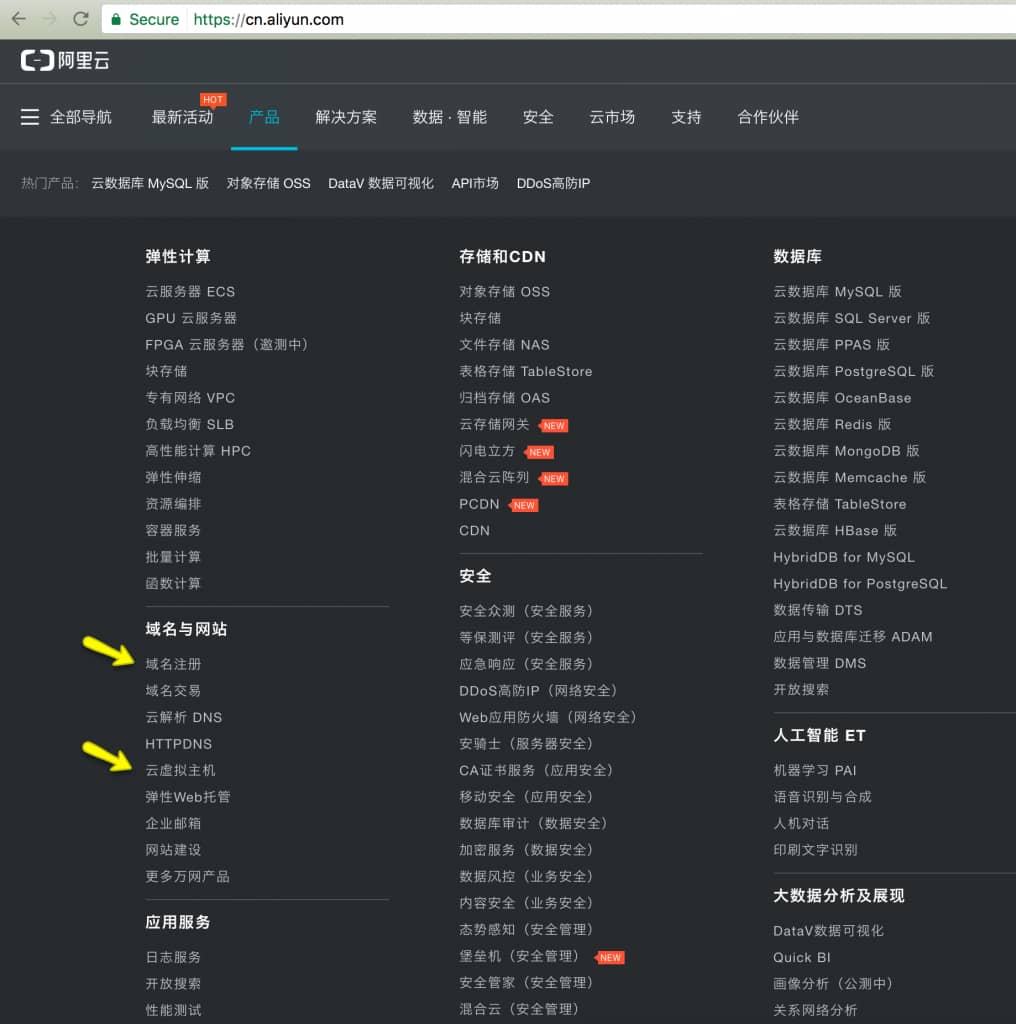 阿里云的流程界面分成两块,下图你看到的是第一块,是用来买各种的阿里云服务的入口,比如我标记的域名注册和云虚拟主机。