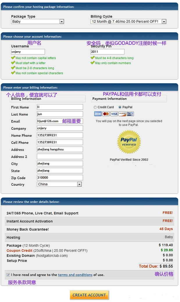 说明:用户名2-8个字符之内,pin码是效验码,也不要乱写,以后确认验证账户需要的,反正在hostgator购买主机的资料需要自己记住,以 后需要验证账户,对自己有好处。其他信息可以用拼音填写,尤其是邮箱重要,需要接收账户密码等信息的。确认价格后,点击”create account“继续支付购买。可以使用paypal支付。