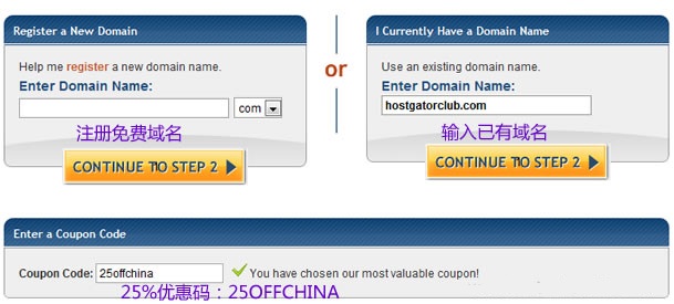 3.可以选择注册一个免费的域名,后者可以输入自己已有域名,或者随便输入一个也可以,主要是用来绑定根目录确定账户的。以后可以更换。默认第一次购买是20%优惠,我们输入最低25%优惠码(25offchina),直接降到最低价格。