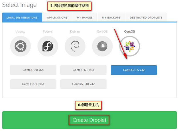 三、选择你比较熟悉的操作系统,因为小z之前有折腾过centos,所以这里选择了32位的centos6.5操作系统。最后点击创建按钮。