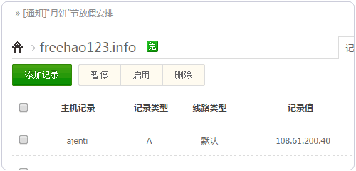 10、域名绑定后,就可以到域名的DNS管理处将域名的A记录解析等转到Ajenti服务器。
