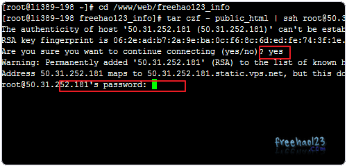 3、public_html是要移动的目录,50.31.252.181这是新的VPS主机,/www/web/freehao123_info/public_html这是将文件存放在新的VPS上路径。