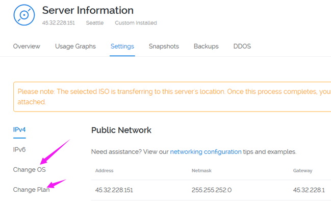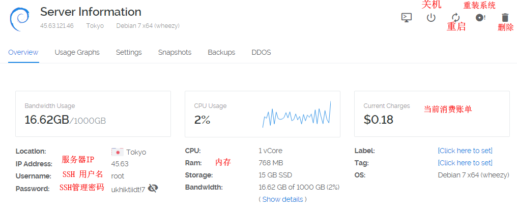 Vultr 的这个控制面板还是比较清新的,VPS的所有功能都在一个页面集中,服务器停止,重新启动,重装系统,删除服务器等指示清晰,非常容易管理。