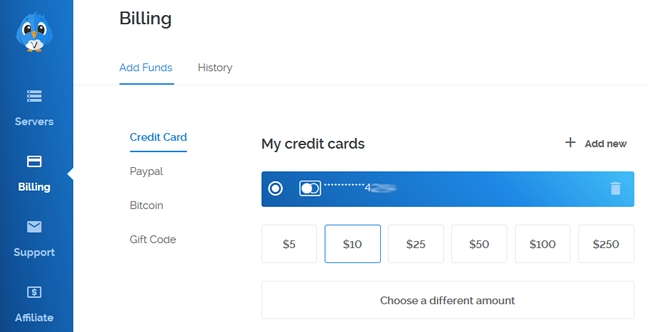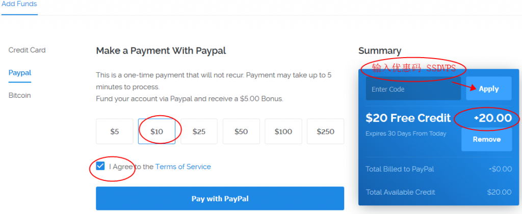 如果说你没有信用卡,但是你有Paypal 账号,那么你需要先点击上面的Expires 60Days From Today 后面的Remove按钮(谨慎操作,Vultr只给一次机会,选择信用卡的同学切勿选择,本操作仅限paypal支付同学使用 ),输入优惠码 SSDVPS 获得20美元一个月的使用权。
