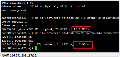 2、这是OneAsiaHost VPS主机磁盘读写速度。不知道后面为什么达到了1GB/s。