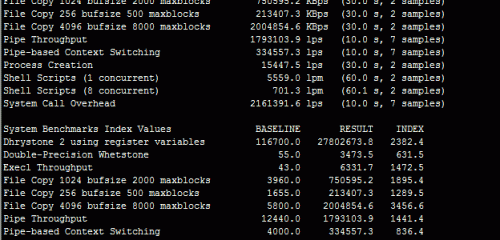 3、用经典的Linux VPS主机性能跑分工具Unixbench 5.1.2测试,256MB内存的VPS最后得分超过了1000。
