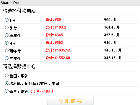 第四步,我选择PRO无限方案,洛杉矶机房(根据自己的需要选择),然后点击”立即购买”。