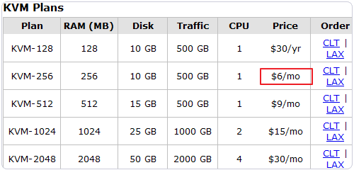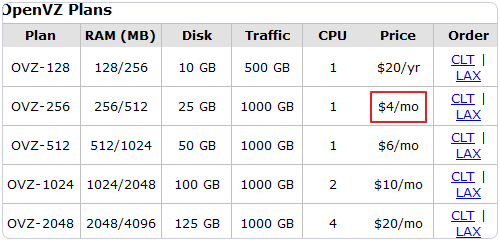 3、OpenVZ和KVM VPS都有年付的VPS主机,最便宜的一款是256MB内存的VPS只要4美元/月。