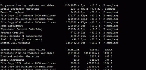 6、用Unixbench 5.1.2测试VPS主机性能,512MB的OpenVZ测试得分在800分。