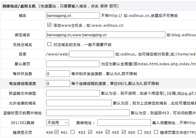一般只要根据上图输入需要绑定的域名就可以,其他都可以默认,比如我们需要过滤和防止图片盗链可以设定一定的图片盗链后缀,一般不设置,除非我们实在不要让引用。如果我们当前服务器有多个IP地址且每个站点对应不同的IP,在选项的”使用IP”可以看到当前服务器的多个IP,然后我们对应选择就可以,一般搬瓦工VPS主机我们就一个独立IP,默认就可以。