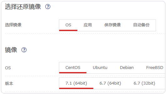 3、在“镜像”中可以选择操作系统CentOS Ubuntu Debian FreeBSD ,版本7.1 (64bit) 6.7 (64bit) 6.7 (32bit) 6.6 (64bit) 6.6 (32bit) 。