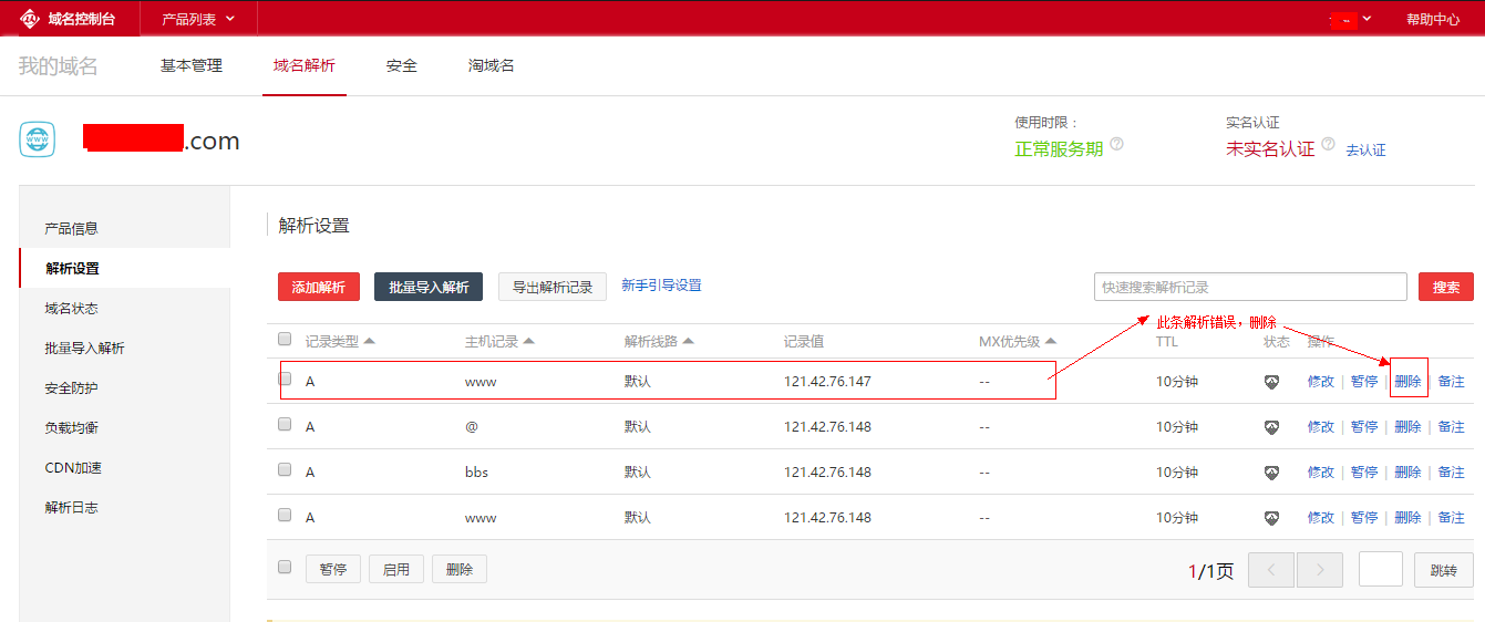登录域名解析平台删除多余解析即可。