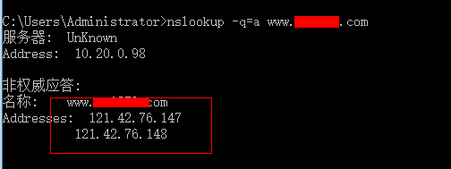 这个时候需要检查自己的域名解析是否解析到了多个IP地址,nslookup -q=a www.abc.com (www.abc.com要改成自己域名)查看自己的解析确实是解析到了两个IP地址。