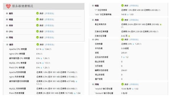 下一代虚拟主机配备Plesk主机面板,该面板内置一个服务器健康监控器,可对服务器的各个方面(包括服务、磁盘、内存、CPU和网络)进行7×24全天候监控,并且会对各个项目当前状况进行具体分析(如下图),若发现任何异常,会立即报告。另外,Plesk还支持通过移动端查看服务器相关信息,并执行一些必要操作。